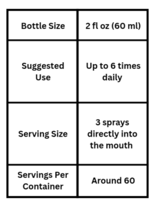 Throat care, spray 1 pump directly in mouth and throat, three times a day for up to 14 days. This helps to kill live bacteria and microbes living in the throat and sinus cavities that could cause illnesses. Extremely beneficial during times of sickness or exposure.